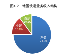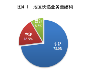 1-5月,东、中、西部地区快递业务量比重分别为73.0%、18.5%和8.5%,业务收入比重分别为74.8%、15.0%和10.2%。与去年同期相比,东部地区快递业务量比重下降2.2个百分点,快递业务收入比重下降1.3个百分点;中部地区快递业务量比重上升1.3个百分点,快递业务收入比重上升0.7个百分点;西部地区快递业务量比重上升0.9个百分点,快递业务收入比重上升0.6个百分点。