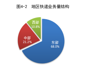 1-3月,东、中、西部地区快递业务收入比重分别为72.7%、16.2%和11.1%,快递业务量比重分别为68.0%、21.2%和10.8%。与去年同期相比,东部地区快递业务收入比重下降1.0个百分点,快递业务量比重下降3.3个百分点;中部地区快递业务收入比重上升0.6个百分点,快递业务量比重上升1.7个百分点;西部地区快递业务收入比重上升0.4个百分点,快递业务量比重上升1.6个百分点。