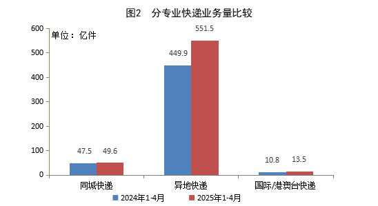 1-4月,同城快递业务量累计完成49.6亿件,同比增长4.4%;异地快递业务量累计完成551.5亿件,同比增长22.6%;国际/港澳台快递业务量累计完成13.5亿件,同比增长25.4%。